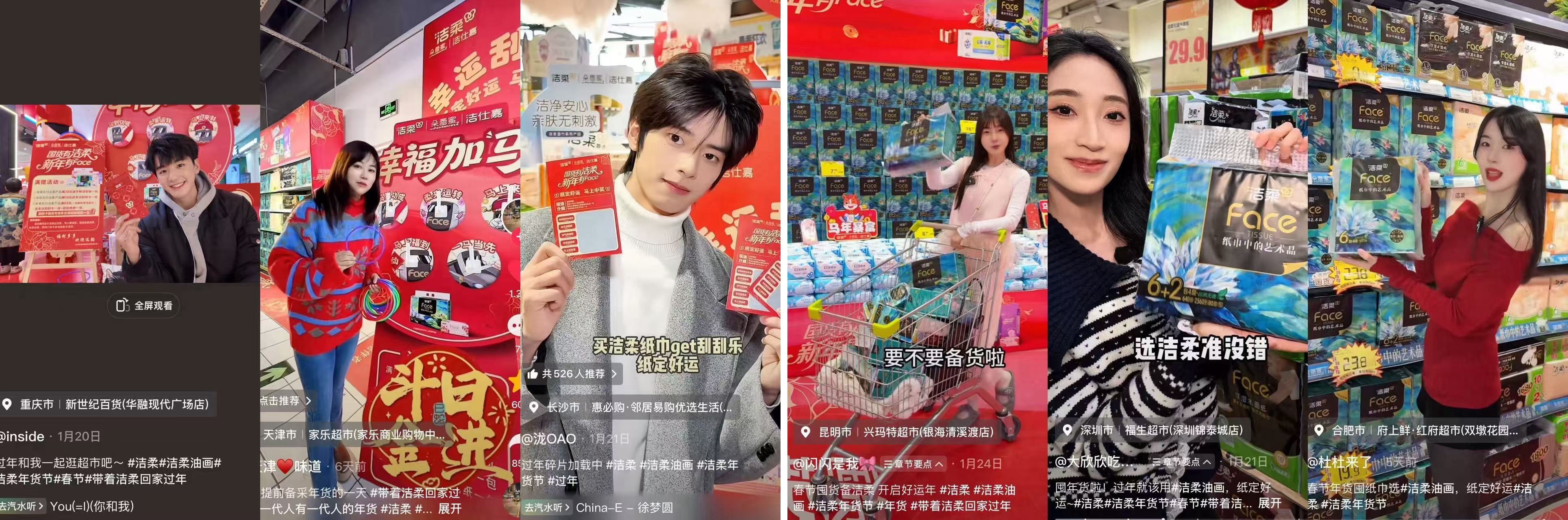 线下活动推进的同时,线上传播同步启动。品牌联动多位城市生活达人,创作聚焦年货采购场景的短视频内容,在社交平台发起#洁柔年货节#话题,相关话题播放量已超647万,单条视频最高点赞达21万次。值得关注的是,视频内容直接关联电商入口与线下商超定位,引导流量转化,而评论区涌现的“中奖”分享与产品好评,则进一步形成了口碑扩散,构建了从内容曝光、兴趣种草到终端购买的闭环路径。
