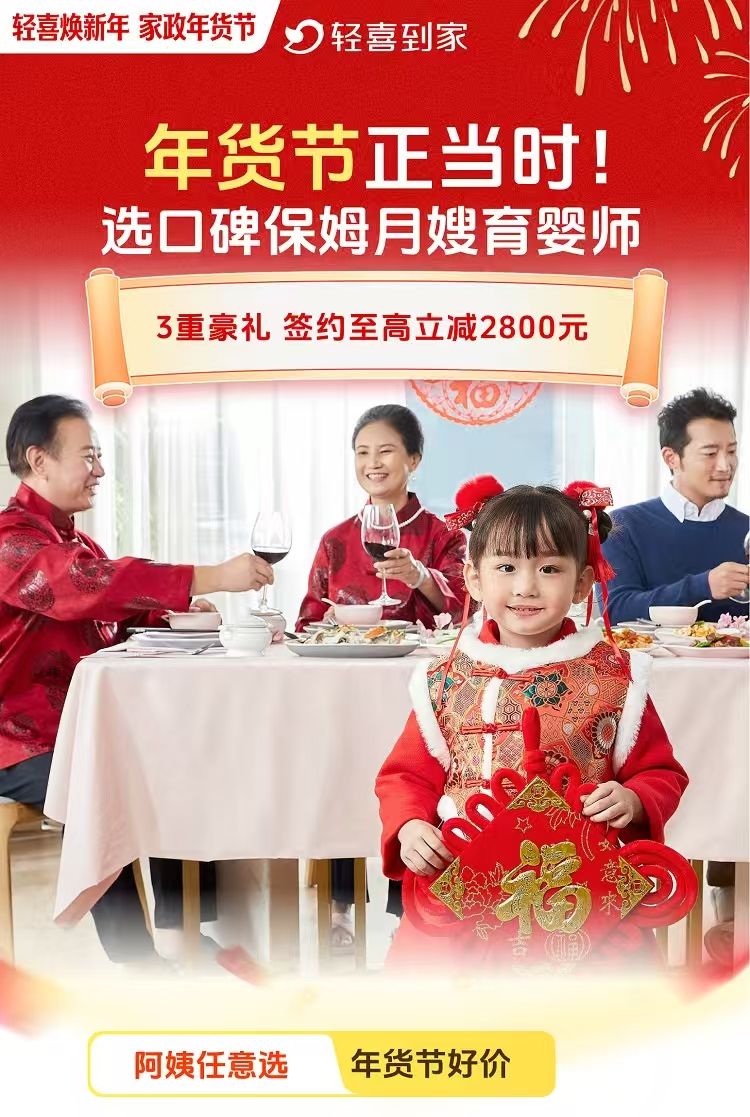 保姆服务则提供星级保姆、小时工、养老保姆等多档选择,不仅可协助筹备年夜饭、照顾家人,更推出新客专享3次体验单,面试3位阿姨的贴心政策,确保服务匹配度。月嫂服务面向新春喜迎新生儿的家庭,提供科学月子护理,并推出新客首单最高立减800元、升级服务再省2800元的专项优惠,让专业照护更可及。