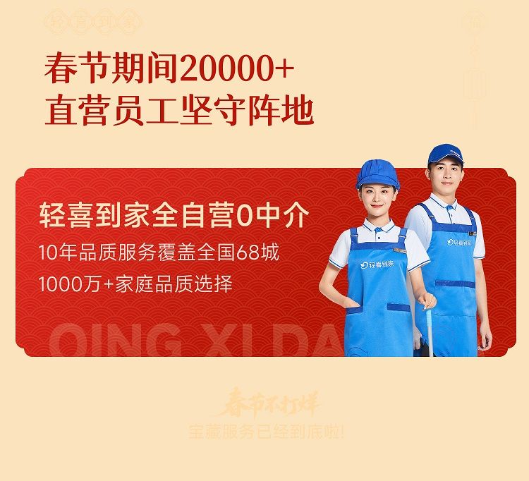 春节前的家政需求并非简单地打扫,而是涵盖深度清洁、家电维护、衣物洗护、长者照护、育婴陪伴等多元场景的综合服务需求。轻喜到家基于对用户需求的深入理解,此次年货节不仅覆盖周期长,更强调服务的专业性与系统性。活动从年末延续至春节后,贯穿家庭焕新的全过程,真正实现从清洁到焕新的升级,让用户从繁杂家务中解放双手,专注享受团圆与喜悦。