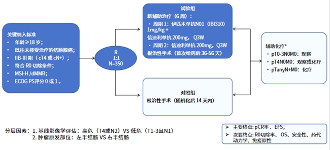 NeoShot-III期研究是一项在中国进行的随机、对照、开放、多中心III期注册临床研究,旨在评估伊匹木单抗N01(IBI310)联合信迪利单抗作为新辅助治疗,与直接根治性手术相比,在IIB-III期MSI-H/dMMR结肠癌中的疗效与安全性。