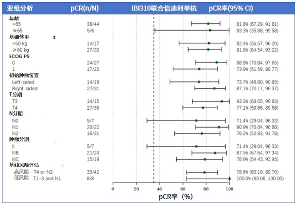 ITT1人群(接受新辅助治疗并完成手术的患者,n=50)分析结果显示,试验组pCR率高达82.0%(95% CI:68.56-91.42);与历史对照的35%相比,差异具有统计学意义(p<0.0001),且R0切除率达100%。即使在临床高危患者中,pCR率仍高达78.6%(与总体人群相似)。伊匹木单抗N01(IBI310)联合信迪利单抗新辅助治疗的疗效不受高危临床因素的影响,为这类通常预后较差、治疗挑战更大的患者群体提供了获得深度缓解的机会。