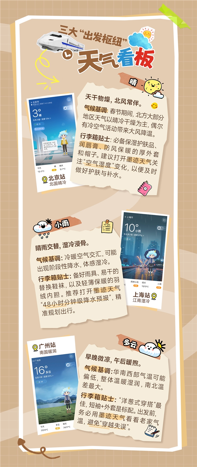 墨迹天气此次推出的「回家天气手账」,并非单纯的创意宣传载体,更是其专业气象能力的场景化落地与直观呈现。依托多年积累的海量气象数据、成熟精准的气象模型研判能力,以及完善的智能预报技术,墨迹天气深入分析春运期间不同区域的气候特征、天气变化规律,结合北京、上海、广州三大枢纽的热门返乡方向,精准拆解各条路线的天气痛点,为旅客提供个性化的气象服务与出行指引,切实解决春运出行中“怕遇恶劣天气”“不知如何应对多变气候”等核心诉求,让气象服务真正贴合用户出行需求。