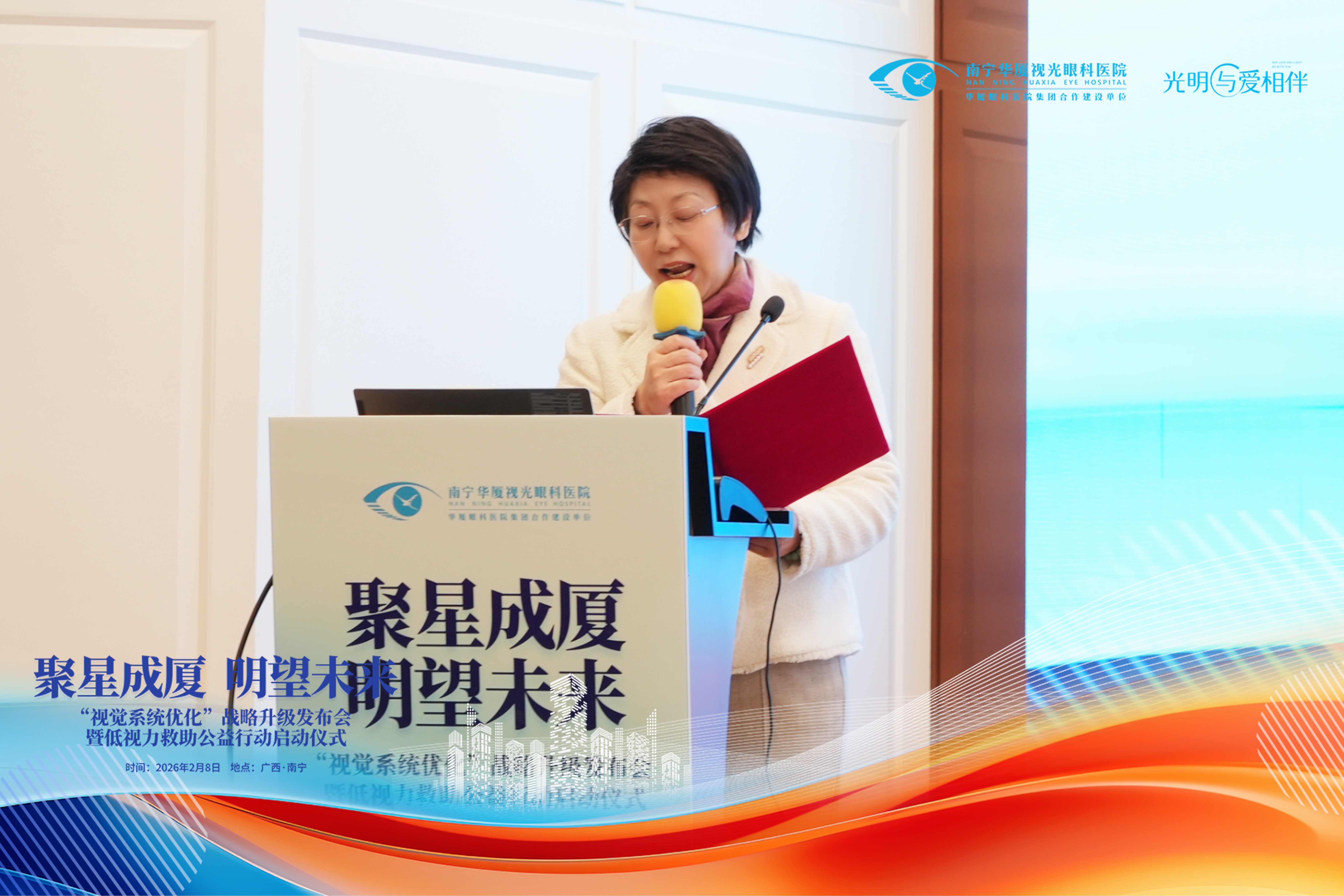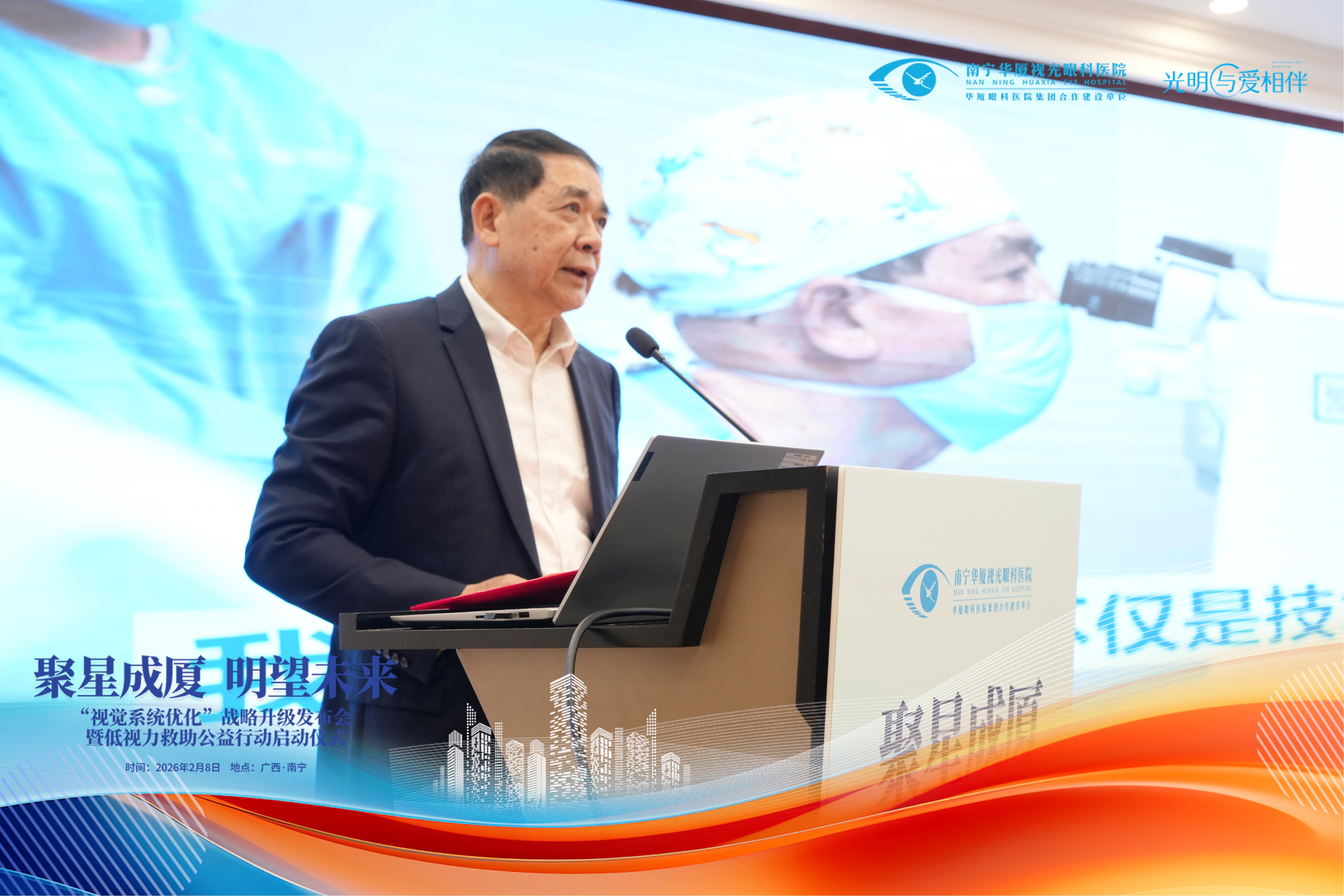 2月8日,南宁华厦视光眼科医院“视觉系统优化战略升级暨低视力救助公益行动”启动仪式在南宁隆重举行。来自南宁、玉林、贵港三地的华厦眼科专家共聚一堂,以技术革新与公益初心,共绘广西眼健康事业新图景。