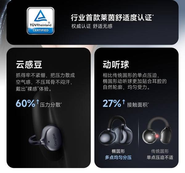如果说抗菌是当贝 Air 1 的差异化护城河,那么佩戴感就是其硬核底牌。作为行业首款通过德国 TÜV 莱茵舒适度认证的耳夹式耳机,它在工程学设计上尽显匠心。0.5mm 零压钛芯记忆无感C桥,材质柔韧且具备极强的自适应能力,无论是大幅度肢体动作还是剧烈震动,都能稳稳锁在耳廓上;配合仅 6.1g 的轻量化身躯与“云感豆”设计,可有效分散 60% 的佩戴压力。更具智慧的是,其 AI 声道自适应功能实现了“盲戴即正确”,让运动员在紧迫的赛前热身中,随手一夹,即刻出发。