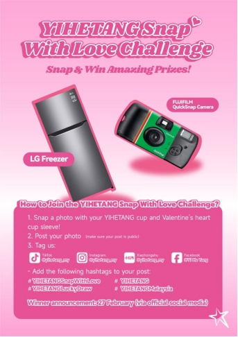 自2月7日起,益禾堂全马门店同步推出“情人节限定杯套打卡挑战”,消费者在社交媒体发布打卡内容即可参与官方随机抽奖。活动奖品包括202L LG Freezer、富士胶片相机等,活动期为2月7日至14日,并于2月27日开奖。同期,时代广场店还设置了“读秒挑战”趣味游戏,消费者凭小票并关注社交媒体账号即可参与。成功停在10秒者可获四选一礼品及免饮券,参与奖为RM1代金券。