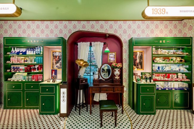 首家复古快闪店位于沙面历史文化街区,这里不仅见证了中西文化百年交融,更曾坐落着屈臣氏其中一家最早期的店铺「屈臣氏大药房」,承载着品牌在中国市场的深厚记忆。快闪店以药房历史场景为灵感,融合岭南建筑风韵与经典港风、现代元素,将屈臣氏跨越世纪的发展历程转化为沉浸式互动空间,步入其中,仿佛迈入时光长廊:米白色浮雕立面与拱形彩色玻璃窗框相映,红白相间花砖透出温润的旧时光泽,深棕色雕花药柜静静陈列。精心复刻的民国风格广告、仿旧手写招牌与传统式样匾额,将屈臣氏与中华大地的历史渊源娓娓道来。