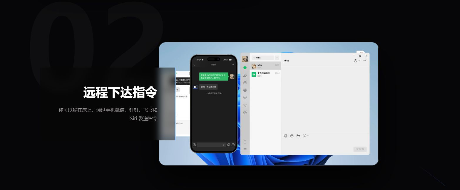 用户只需一键安装,即可快速部署,无论是Windows系统还是Mac平台,都无需具备任何编程知识。更为颠覆的是,Molili创造性地将微信变成了AI指挥中心。用户无需安装额外控制端,只需通过日常使用的微信对话框,即可随时随地向家中或办公室的电脑下达指令。这种“微信即指挥部”的模式,让远程办公、任务自动化变得像发送消息一样简单自然,被许多极客评价为从“开坦克”式远程操控,到“发指令”式智能管理的飞跃。