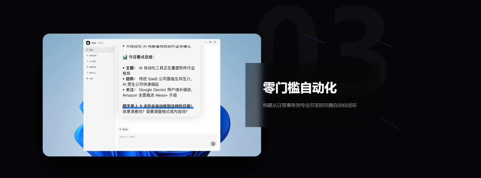 传统AI对话模型大多停留于信息问答与内容生成,而Molili的核心突破在于其接入了先进的VLA模型能力,实现了“看懂屏幕”并“直接操纵软件”。这意味着AI从“参谋”变成了“执行者”,能够理解用户的自然语言指令,并自动在电脑端完成一系列跨应用、跨流程的复杂操作。