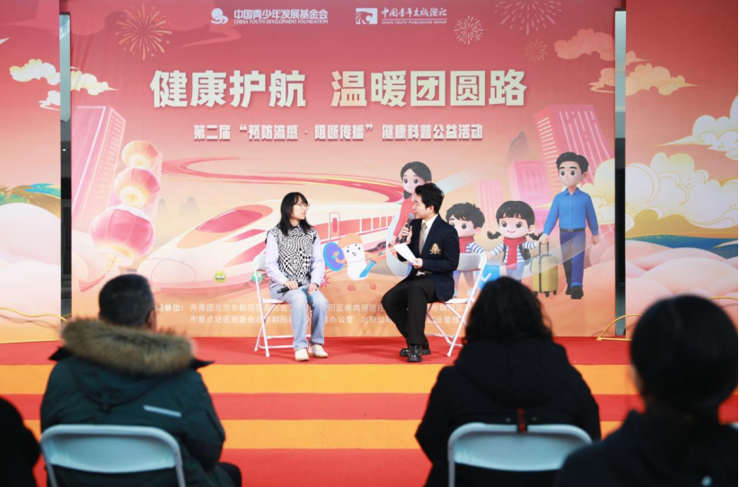 2026年2月11日,北京朝阳站交通枢纽地下一层大厅内暖意流动。面对春运期间流感等呼吸道传染病传播风险,由中国青少年发展基金会与中国青年出版总社联合共青团北京市朝阳区委员会、北京市朝阳区疾病预防控制中心、北京市重点站区管理委员会北京朝阳站地区管理办公室、北京公联交通枢纽建设管理有限公司,共同发起“健康护航,温暖团圆路”春运健康公益行动,守护旅客平安健康返乡。