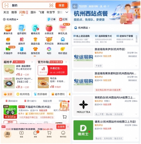 据悉,这是淘宝闪购联合旅途易购在年前联合推出的“高铁站点餐”服务。旅客无论在哪,只需打开淘宝APP或支付宝APP,并将淘宝闪购的收货地址选择为特定站点,即可在进入“高铁站点餐”频道。
