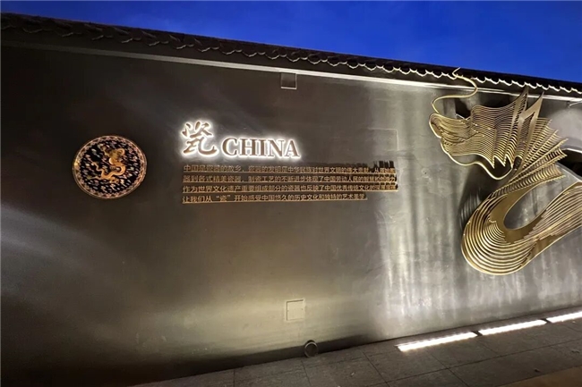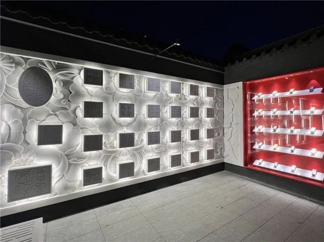 可坐的“印章”座椅,以中国四大名石章料为灵感,篆刻着“潘家园”等字样,坐上去便与金石文化撞个满怀;地面上,各种传统工艺瓷盘“铺满”墙面,每一个都藏着瓷器背后的技艺故事。
