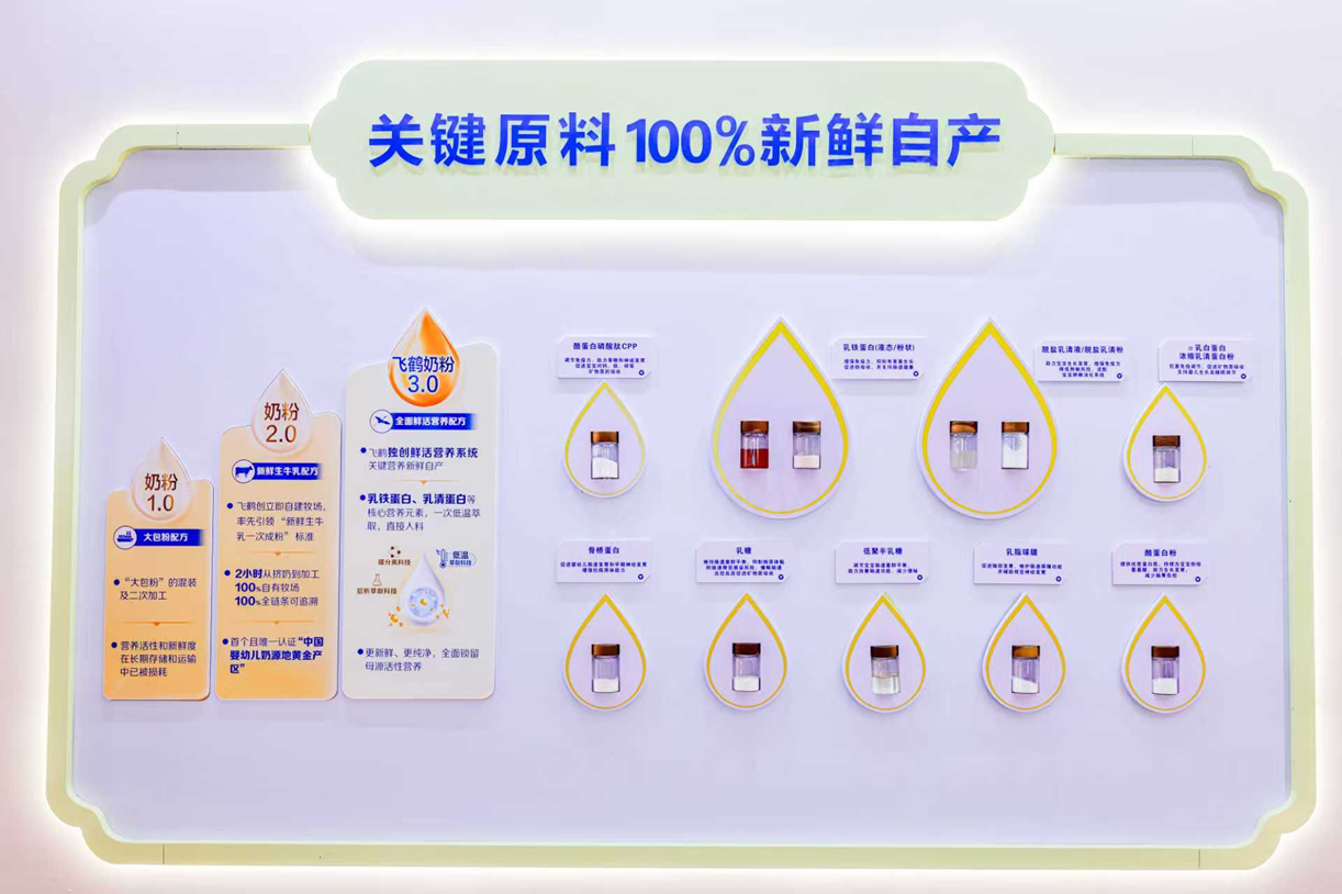 飞鹤定义了婴幼儿配方奶粉的新鲜标准——自2006年起,飞鹤率先自建牧场,实现100%自有牧场与奶牛、100%自有生牛乳,从源头实现奶源的新鲜与安全。2018年,飞鹤携手中国标准化研究院,建立以“新鲜生牛乳一次成粉”技术为核心的奶粉生产标准,并推动其成为奶粉行业的标配。2026年,飞鹤已掌握11种关键原料自产能力,并发布了全球首个新鲜原料溯源系统,首发应用在新品飞鹤迹萃、飞鹤启萃上。飞鹤将“原料级”溯源带入公众视野,也为行业建立了“原料可追溯、安全可验证、鲜活可衡量”的新标准。