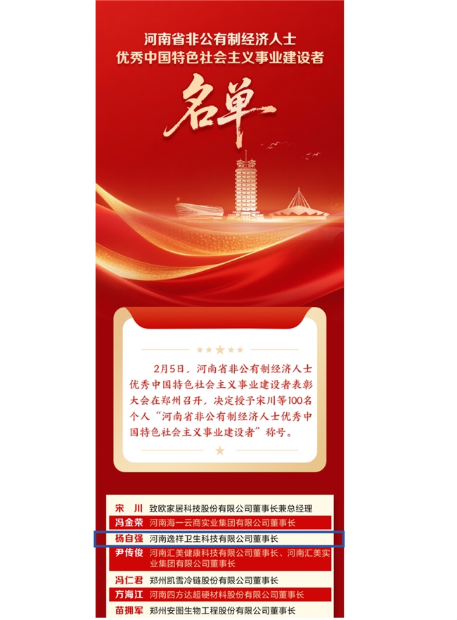 近日,河南省非公有制经济人士优秀中国特色社会主义事业建设者表彰大会顺利召开,授予河南逸祥卫生科技有限公司董事长杨自强先生 “河南省非公有制经济人士优秀中国特色社会主义事业建设者”称号。