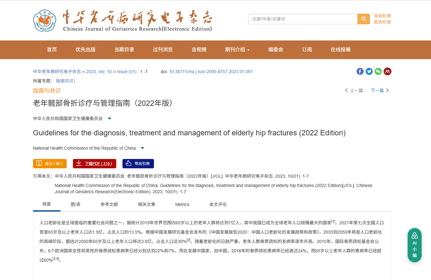《老年髋部骨折诊疗与管理指南(2022年版)》指出,我国老年人髋部骨折高发,高致残致死率成健康隐患
