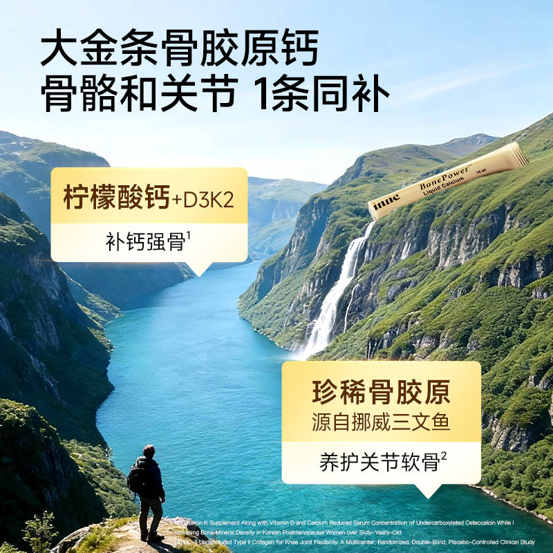针对中老年群体骨健康营养补充的核心需求,科学配比骨胶原钙的营养补给成为关键。德国高端营养品牌inne(中文名:因你)推出“全球首款骨胶原钙”——inne因你大金条骨胶原钙,融合柠檬酸钙搭配高纯度骨胶原,配合VD3、VK2等关键营养素,采用0糖0碘0嘌呤配方及液体剂型,安全易吸收,临床证实连续补充3个月可有效提高骨密度2.5%,缓解腿疼40%,为中老年人的健康生活筑牢底气。