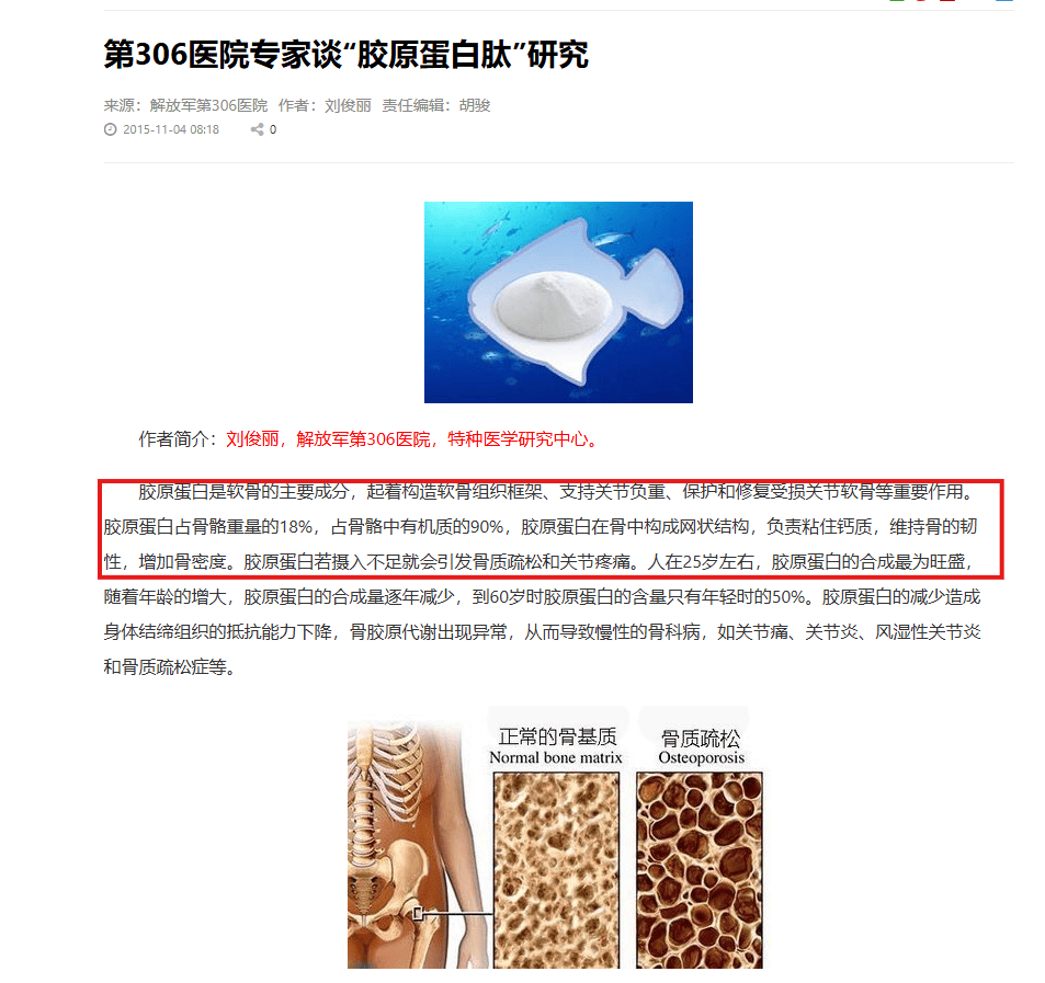 解放军第306医院特种医学研究中心专家刘俊丽表示,骨胶原约占骨骼有机基质的90%,是构筑骨骼“钢筋架”的核心成分。