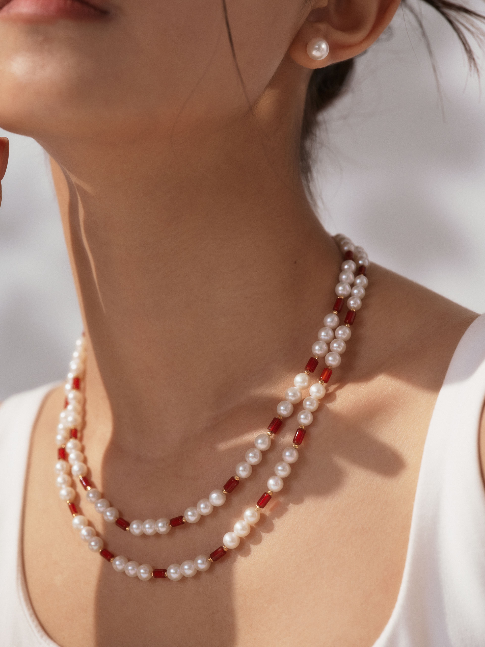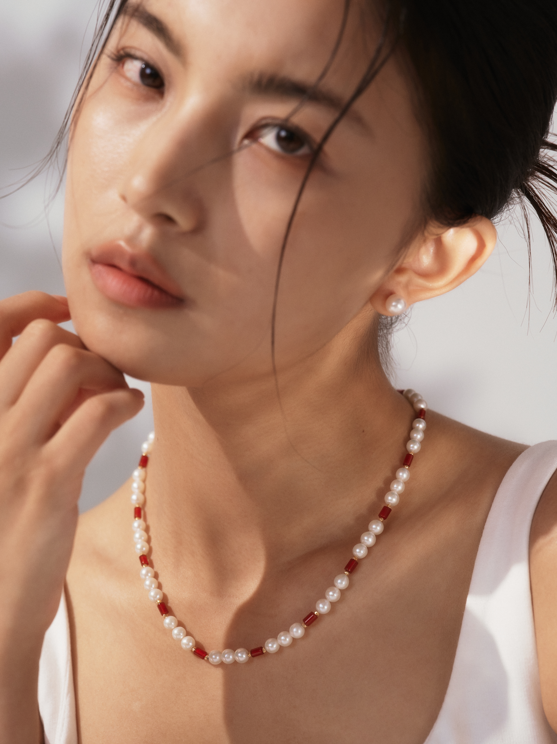 初见“惊鸿”,便会被它那浓烈艳丽的赤红所吸引。“惊鸿-红山茶玛瑙珍珠项链”的红玛瑙如燃烧的火焰,饱含着热情与活力;设计师并未让这份红独自张扬,而是以莹润白珍珠交替串联,形成富有节奏感的红白韵律,既有复古宫廷的肌理感,又不失现代的利落线条。