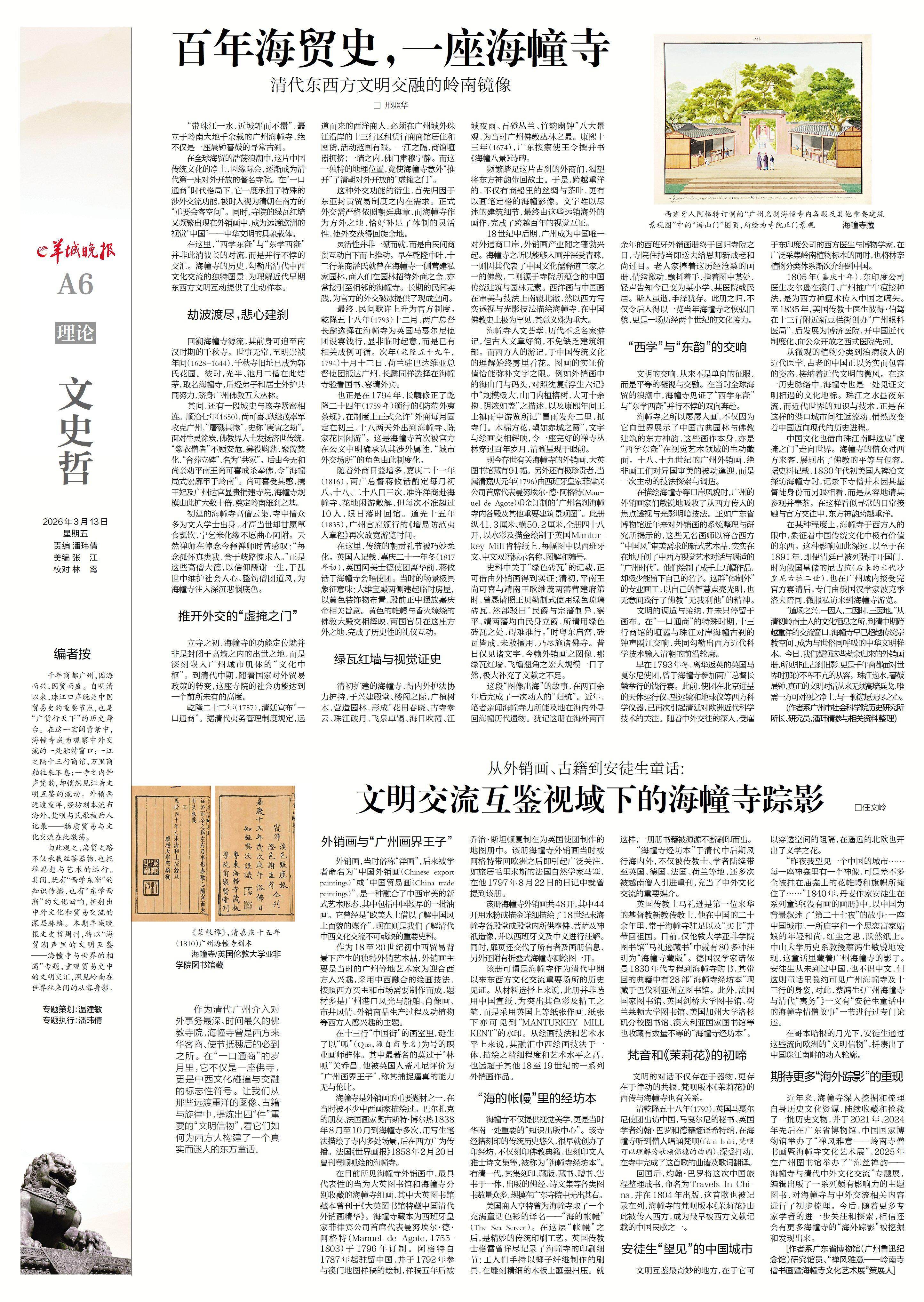 由此观之,海贸之路不仅承载丝茶器物,也托举思想与艺术的远行。其间,既有“西学东渐”的知识传播,也有“东学西渐”的文化回响,折射出中外文化和贸易交流的深层脉络。本期羊城晚报文史哲周刊,特以“海贸潮声里的文明互鉴——海幢寺与世界的相遇”专题,重观贸易史中的文明交汇,照见岭南在世界往来间的从容身影。