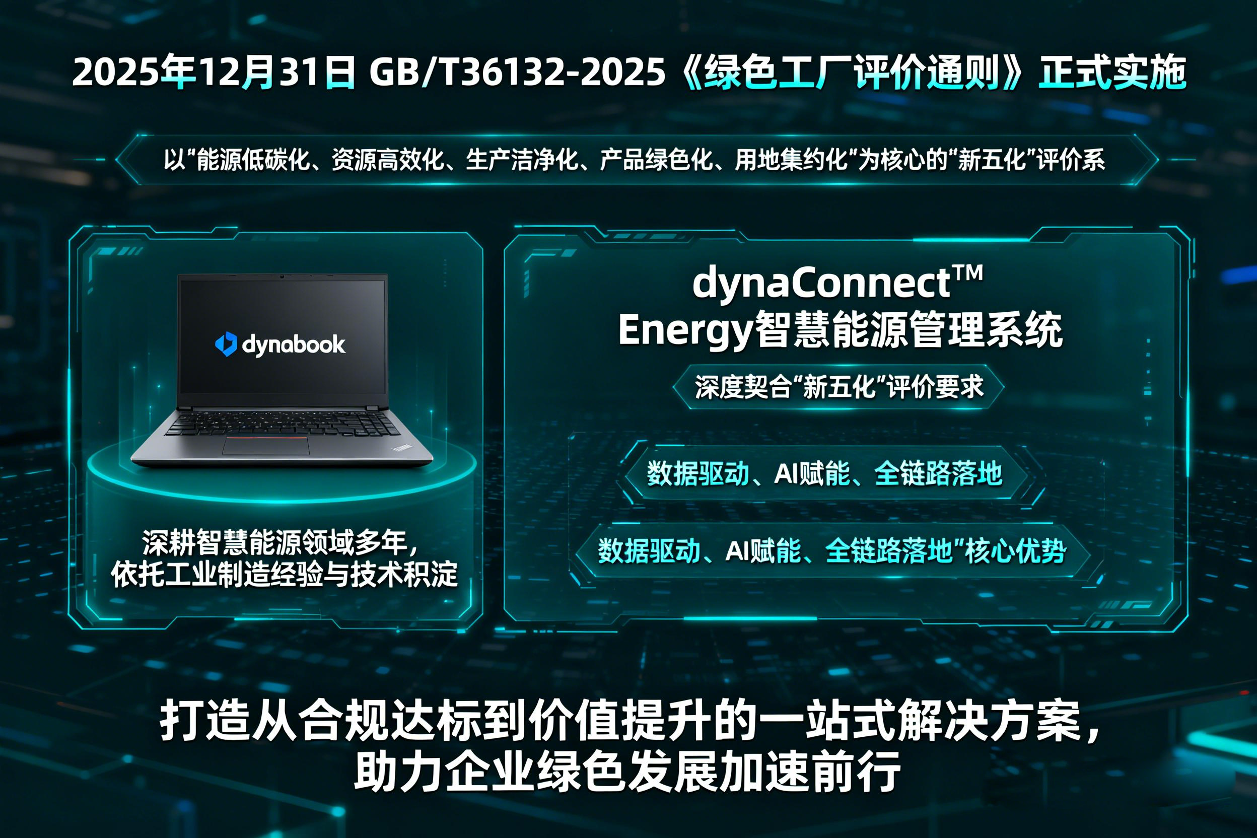 2025年12月31日,GB/T36132-2025《绿色工厂评价通则》正式实施,标志着我国绿色工厂建设进入标准化、精细化新阶段。新国标以“能源低碳化、资源高效化、生产洁净化、产品绿色化、用地集约化” 为核心评价体系,强化了碳排放强度、可再生能源利用率、碳足迹量化等关键指标的考核要求,为企业绿色转型划定了明确方向。dynabook深耕智慧能源领域多年,重磅推出dynaConnect™智慧能碳管理系统,深度贴合新国标评价要求,以数据驱动、技术赋能、全流程落地的核心优势,成为企业达标绿色工厂的“智能管家”,助力企业在低碳转型中抢占先机。