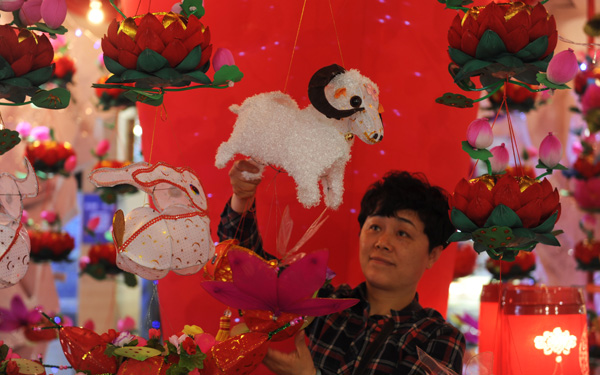 2月15日,在江苏省扬州市一商场,售货员在摆放新上市的“羊灯”。