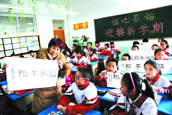 3月9日,日照市外国语学校六年级七班学生们正在展示“寒假作业”。当日,我市中小学开学,学生们带着别具匠心的假期作业陆续返校。 开学首日,学做一道年夜菜、写一幅书法作品、了解日照春节民俗等“趣味作业”受到热捧,让孩子们在快乐中学习,积累了传统文化知识。 (记者 张磊摄)