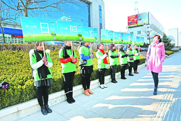 3月10日,环保志愿者高举“日照你好,雾霾再见”的环保牌子走上街头,通过集赞种树的形式,呼吁广大市民共同关注城市环境,用行动为日照增添绿色,成为城市中一抹行走中的绿色。据了解,该公益活动由山海天城建集团发起,用4天时间集赞5000个以上,号召市民用自己的实际行动为日照环保贡献一份力量。 (记者 潘一凯 摄)
