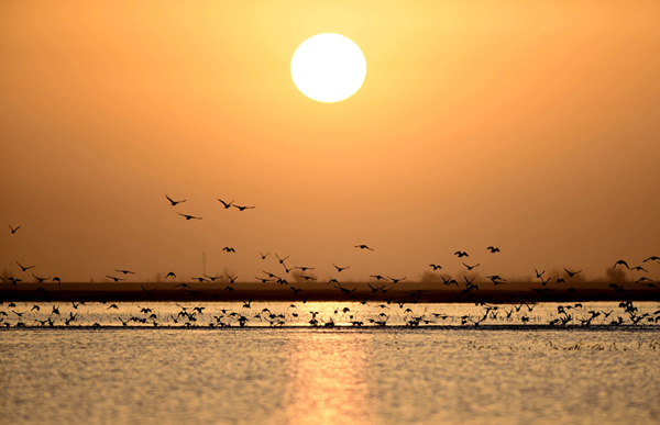 3月23日,一群野鸭在黄河内蒙古达拉特旗树林召段的河滩水面上飞翔。 随着黄河内蒙古段逐步开河,黄河河面滩涂及周围的湿地、湖泊迎来了从中国南部地区迁徙到俄罗斯西伯利亚地区的数百万只天鹅、鸿雁等鸟类,它们要在这里觅食、休息一个月左右,以补充体力。 新华社记者 任军川 摄