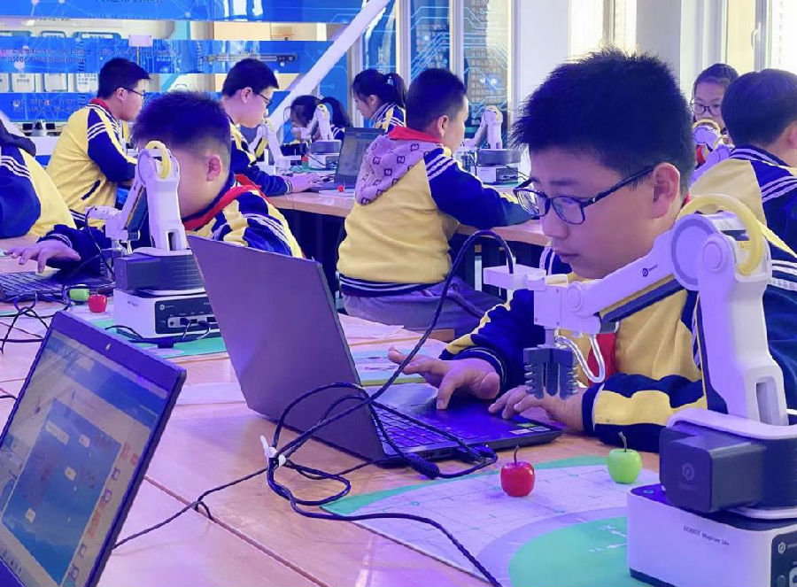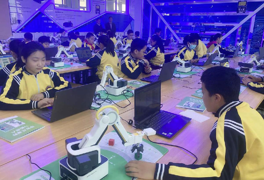 “我们的人工智能实验室在去年12月建成,现在学生们已经能操作机械臂对实验道具‘小苹果’进行智能采摘。老师在教授知识的同时,也在不断地学习,和学生们一起成长。”献唐学校人工智能课授课教师马萍介绍。