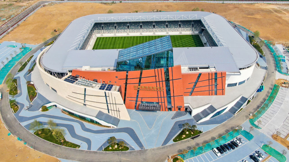 4月29日拍摄的日照国际足球中心项目。(无人机拍摄)