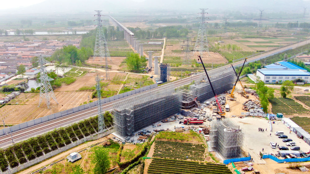 4月29日拍摄的日照岚山疏港铁路工程跨青连铁路转体桥建设项目施工现场。