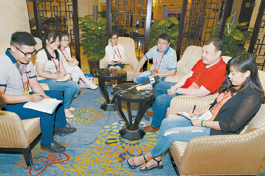 6月14日,日照岚桥锦江大酒店,媒体记者在采访哈萨克斯坦《24KZ》哈巴尔电视台台长谢伊特马梅特(右二)。当日,参加第三届中国-中亚合作论坛的代表和媒体记者陆续抵达日照。 (记者 陈为峰 摄)