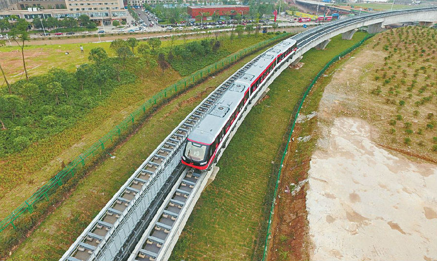 上线试运营的长沙磁浮快线(5月6日摄)。 5月6日,中国首条完全拥有自主知识产权的中低速磁浮商业运营铁路———长沙磁浮快线载客试运营,标志着中国磁浮技术实现了从研发到应用的全覆盖,成为世界上少数几个掌握该项技术的国家之一。长沙磁浮快线连接长沙火车南站和长沙黄花机场,全长18.55公里,于2014年5月开工建设,列车全程运行时间19分30秒,最大载客量363人,单程票价20元。(新华社记者 龙弘涛 摄)