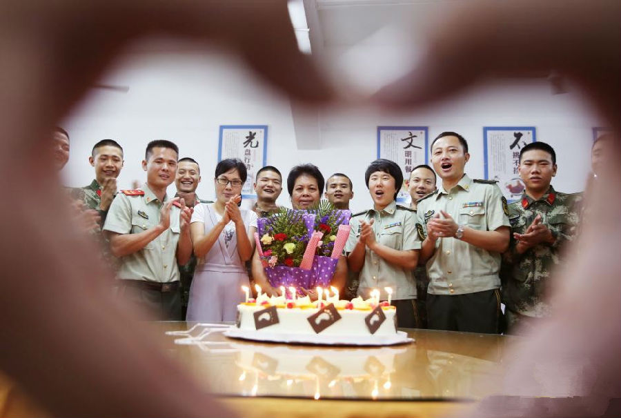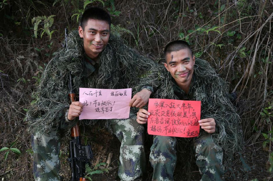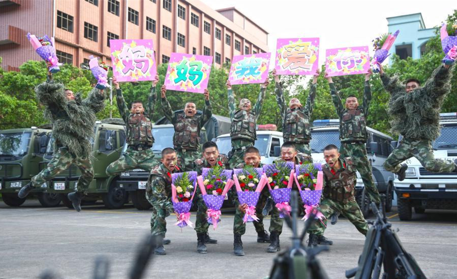5月7日,母亲节来临之际,武警广西防城港边防支队机动大队的官兵们别出心裁书写了一封封独一无二的赤子“情书”,为远在千里之外的母亲送上最真诚的祝福。图为官兵们结束了一天紧张的训练,在操场上手捧鲜花,高举温馨的标语,为远方妈妈送去祝福。