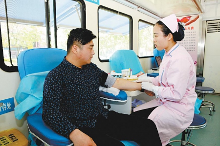 当日是“五四”青年节,许多青年志愿者和市民捋起衣袖,到附近的流动献血车无偿献血,用实际行动服务社会回报社会,度过一个有意义的“五四”青年节。 (本报记者 路杰 摄)