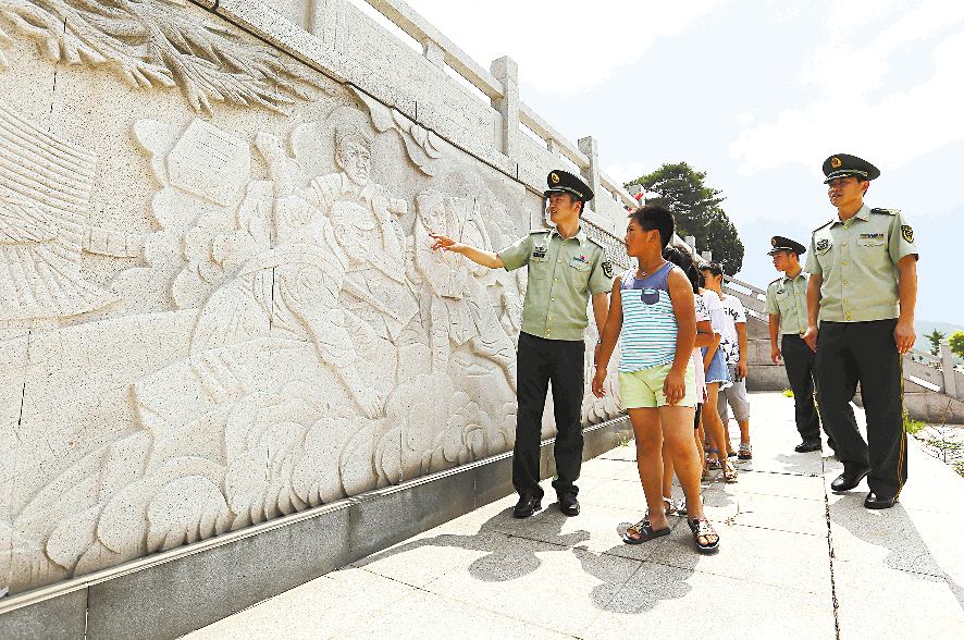 8月12日,武警官兵在为学生们讲解抗战故事。 当日,武警日照边防支队安东卫边防派出所组织官兵和辖区中小学生来到岚山区革命烈士纪念碑前开展“缅怀先烈 维护和平”纪念抗战胜利71周年主题教育活动。边防官兵和学生们在革命烈士纪念碑前向革命先烈们敬献鲜花寄托哀思,并一起参观了纪念馆内的历史照片和文物。通过本次活动,武警官兵与学生们重温了那段峥嵘岁月、了解了先烈的英雄事迹,更加坚定了自己为实现中华民族伟大复兴而奋斗的理想信念。 (记者 赵怡凯 摄)