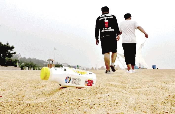 8月15日,游客将喝完的饮料瓶随手丢弃在景区的沙滩上。 夏季,是我市的旅游旺季,不少游客来到我市避暑旅游、欣赏美景。同时,一些不文明行为的出现,不仅影响了文明旅游形象,还带来了一定的安全隐患。我们呼吁,别让不文明行为给旅游好心情添堵,文明旅游从你我开始。 (本报记者 曹钰迪 摄)