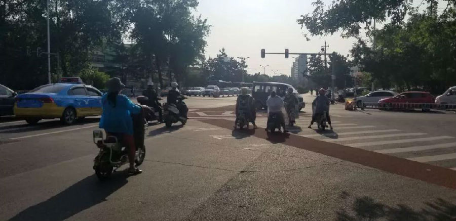 路口用比较显眼的红色施划出了一个专用的非机动车道,下一步准备对这个路口的红绿灯配时也进行一些调整,非机动车专用道主要用来提示非机动车要沿着这个车道行驶!