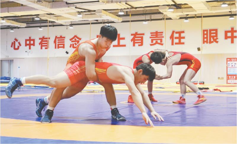 2月5日,在日照市体育运动学校,摔跤队运动员正在进行技术动作训练。