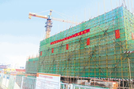 今年以来,莒县以22个重点项目为抓手,加快沭东新城核心区建设。作为22个重点项目之一的新城大厦项目,设计为“三星级绿色建筑”,占地面积约20亩,建筑面积2.2万平方米,计划10月30日前完成主体工程,2018年6月30日前竣工并交付使用。图为新城大厦项目建设现场。 (本报通讯员 王晓龙 摄)