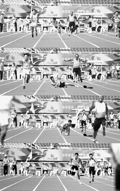 9月13日,全国第九届残疾人运动会暨第六届特殊奥林匹克运动会田径比赛在成都市体育中心拉开战幕,在男子T42级100米决赛中,该项目全国纪录保持者、山东选手李茂大在鸣枪出发后义肢意外脱落并摔倒,随后迅速爬起,手持义肢坚持完成了比赛。 图为位于第五道的李茂大从跌倒到爬起继续比赛的全过程瞬间。(新华社记者 夏一方 摄)