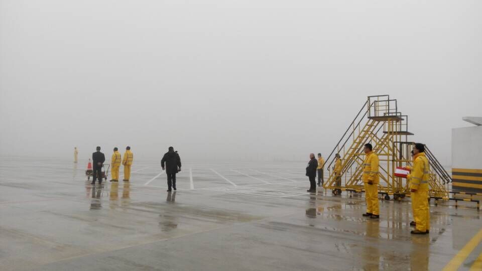 停机坪内机务工作人员正在准备接机工作(日照日报社全媒体报道 史淑梅 摄)