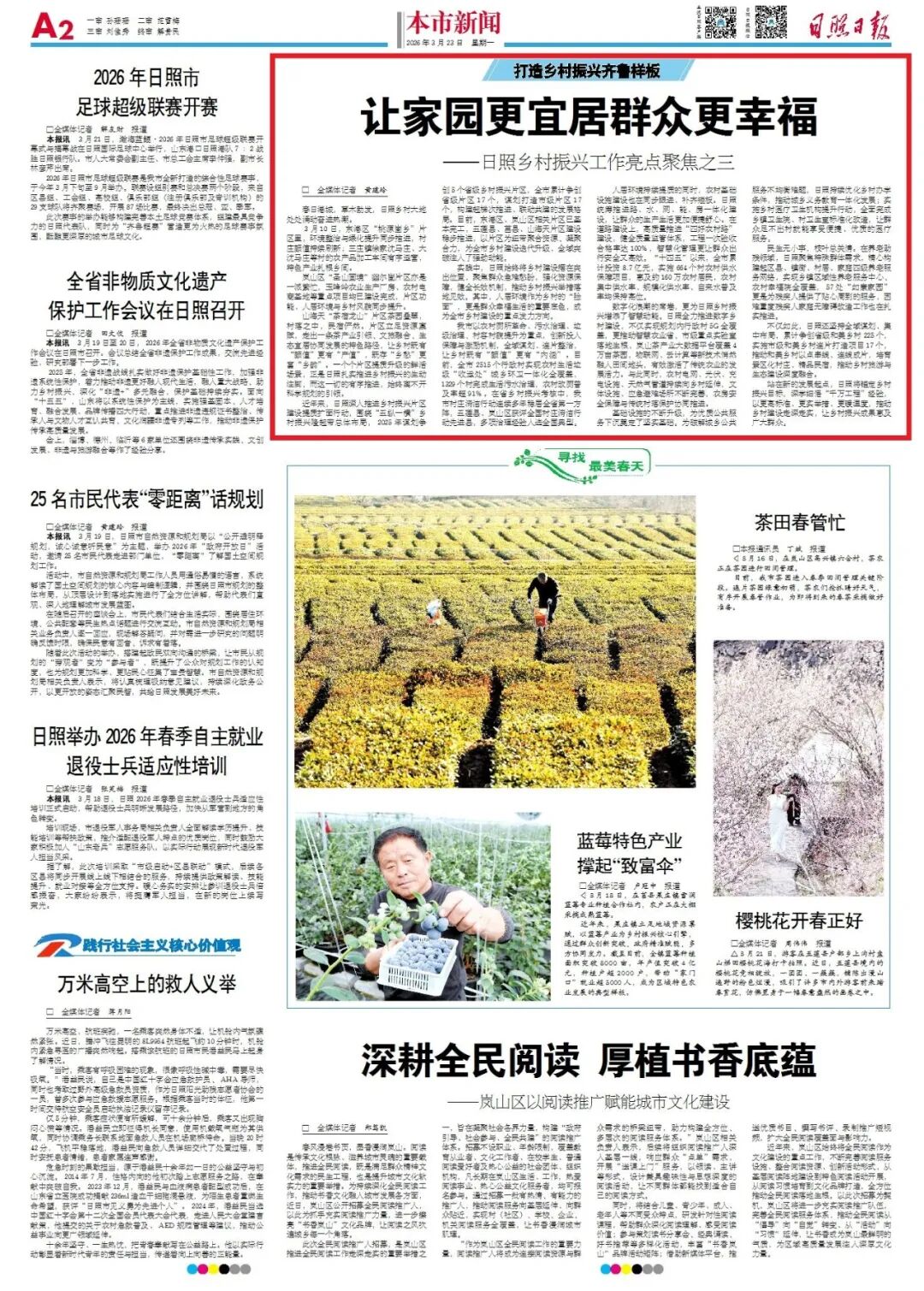 春日的日照乡村,涌动着蓬勃的发展热潮。从东港区的“桃源崮乡”到岚山区的“圣山画境”,再到山海天的“茶宿龙山”,一个个乡村振兴片区正焕发新颜。这背后,是日照市坚持以科学规划为引领,扎实推进乡村建设,推动人居环境、基础设施、公共服务全面提升的系统实践。如今的日照乡村,既有“颜值”与“产值”,也留住了“乡愁”与“乡韵”,成为齐鲁乡村振兴图景中一处生动注脚。