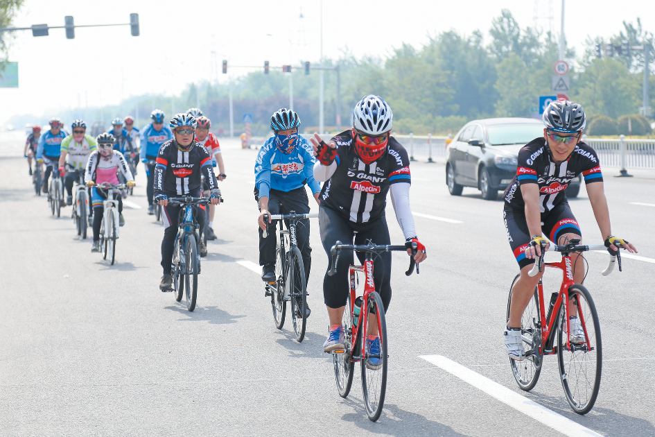 6月7日,自行车爱好者在山海路骑行。 当日,20多位日照捷安特自行车俱乐部的骑行爱好者通过绿色骑行的方式,宣传低碳环保、绿色出行的生活理念。虽然天气炎热,但是依然没有阻挡骑行爱好者的运动热情,他们纷纷表示,通过骑行提高了身体素质,并且愉悦了心情。如今,越来越多重视环保和健康的人们开始加入骑行一族,身穿骑行服的骑行队伍成为了市区一道靓丽的风景线。(记者 潘一凯 摄)