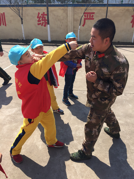 在小记者们的强烈要求下,六位边防官兵手把手的教他们擒敌拳,别看学的时间短,但小记者们做的有模有样,赢得了官兵们的阵阵称赞。